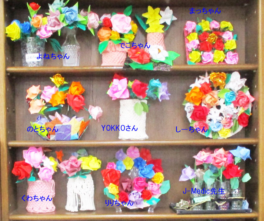 私の作品です。色紙で三種類のバラの花を作りました。川﨑ローズ、マコトローズ西川ローズの。三種類です。なかでもマコトローズが一番難儀難しました。