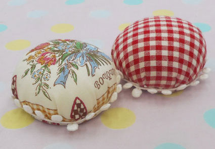 作り方 表布は二枚円形(表に出る布と薄いキルト芯)キルトに綿を詰め回りをグシ縫いしてちじめる。底は直軽5pぐらいの厚紙に底布をぐし縫いして本体にボンドで貼り付ける