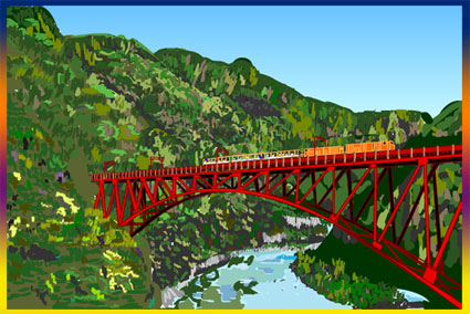 橋桁から透けて見える山に色を描くのに苦労しました。列車は欅平までの観光列車です。後ろ三両に人が乗っています。奥の山に色を描くのを三段に分けました。
