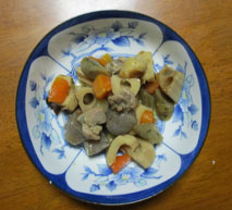 筑前煮 材料は定番のものレンコン コンニャク ごぼうは煮こぼしして人参 鶏肉 竹輪といっ しように油で炒めてだし汁をいれ調味して煮付けます
