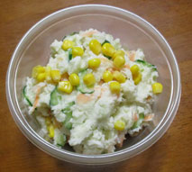 | ポテトサラダです定番のいもときゅうり 玉ねぎ コーン いもは茹でてつぶして熱いうちにマヨネーズと混ぜること |