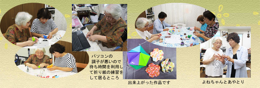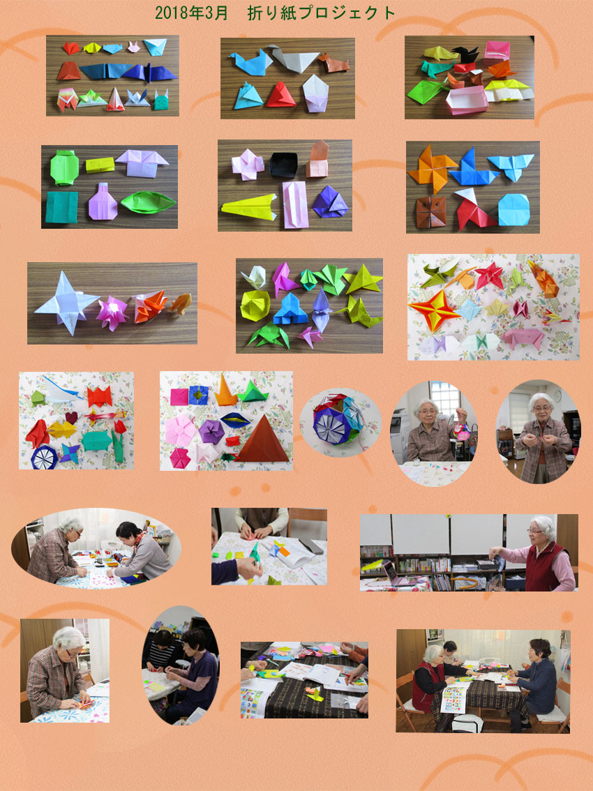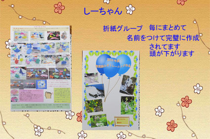 3月から、折り紙が始まりました。一番から百番まであります。お茶の時間に教えて頂きます。私は六十四番まで出来たところ、体調不良になり月末まで休みました。折り紙のことが気になって仕方ありません。皆さん全部仕上げておられるだろうと思うと気が気でなりませんでした。四月に入って二日間で残り全部が出来上がりました。幸いなことに、二日間は他のメンバーさんのお休みが多くて先生と差し向かいでトントンと進みました。先生や皆様に感謝しております