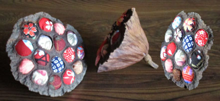 左の材料は蓮の花が終わって果実又は種子が詰まっている物(蓮台、花托)とも言われています。種を取った後のくぼみに詰めました。直軽4〜5センチ程の端切れの周りをぐし縫いして手芸綿をつめて絞りそのくぼみに詰め込みました。