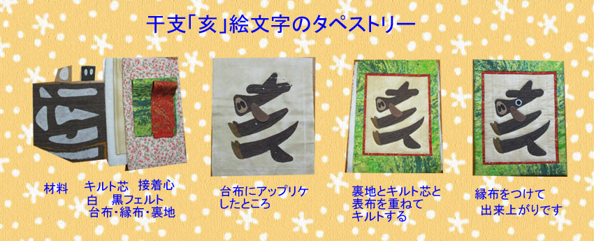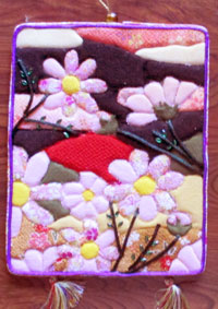 このタペストリーはアップリケをしてから裏布とキルト芯と表布と重ねてキルトをするので大変です。一番難しい所は足袋のところが小さいのでアップリケ時もキルトの時も大変でした。 |