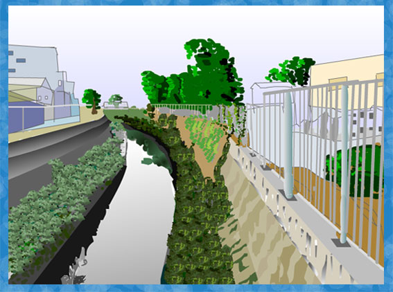 今林の、橋の上から見た平野川の景色です。朝に撮りましたので、左側は暗く右側は少し明るくしました。水の色と空の色は助けて頂きました。土手の 明暗 柵もなかなか難しいでした。