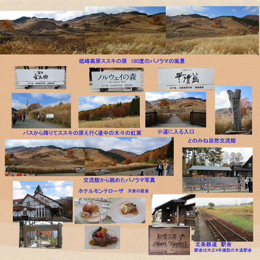 | 11月8日農協女性会秋の日帰り旅行の時の写真 砥峰高原=ホテルモンテローザ{洋食の昼食}=北条鉄道=三木サービスエリア=平野支店に無事に帰ってきました。お天気にめぐまれて一日楽しく過ごしてきました。 |