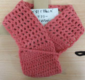 よねちゃん かぎ針編みのマフラー毛糸が足りなくなりそうで透かし模様にした。よい考えですね。 |