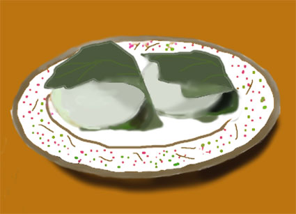 端午の節句の柏餅をクリスタ画に描きました。最初はお餅は草餅でしたがあまりにも色合いが暗くなりますので普通のお持ちの色に描き換えました。お皿の模様もかんたに描き替えました。