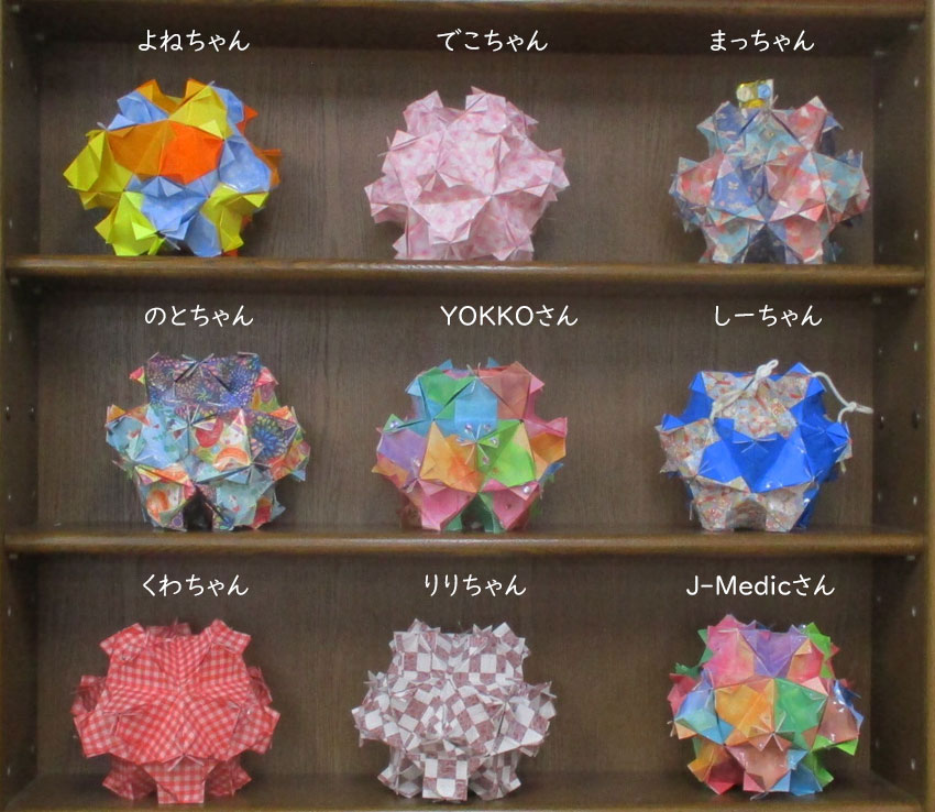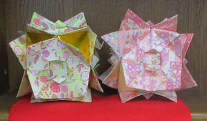 小さい本から「うたたね」一つではさみしいですので二個作りました。いつもの折り方ですが三角接手が入っています。似たようなくす玉が多い中で、この「うたたね」中心の花用の紙が小さいので、可愛い感じがします。 |