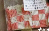 マクラメ編みのコースター、ピンクと白とで縦編横編み素敵です。 |