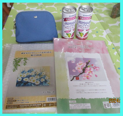 夏の健康相談抽選会で頂いた品物です、ちぎり絵の桜とキャンバスを塗り彩る優雅な絵画(マーガレット) かわいいポセット ジュウース2個です。