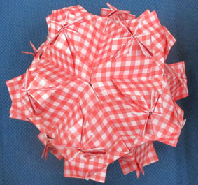 「陽だまり」の折り方です。6ピースのくす玉です折り方は割と簡単でしたが房を作るのに随分と苦労しましたリリアンは糸がつるつるしててきつく結んでもしまりが悪く緩んできて大変でした。 |