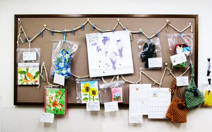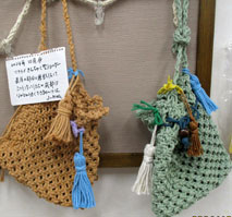 | 7月のミニ展示会の作品です。 皆さんそれぞれ気持ちを込めて作られた作品です。マクラメ編み ストレッチ編み パッチワーク 造花等で色々にぎやかで楽しそうです。。 |