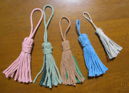 お茶の後の時間におしえていただいたタッセルです。作り方は皆さんそれぞれ教えていただいているので説明はやめておきます。マクラメ編みの残りの糸で作りました。 |