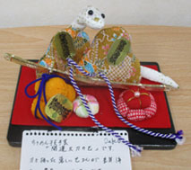 今年の干支の辰と宝袋を載せました。ちりめんの生地で作るので伸びチジミして大変でした。辰の胴には綿の中に針金を入れて自由に曲げられるようにしました。宝袋は中に綿を詰めるだけで簡単にできました。 |