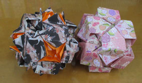 これは私の作品です。折り方は両方とも出来上がりまで同じですが、姉妹の方に四分の一の紙で座布団折りをしたのを窓に差し込みます。左の作品でオレンジ色に見えてる部分です。簡単に見えていますがちょとややこしいでした。 |