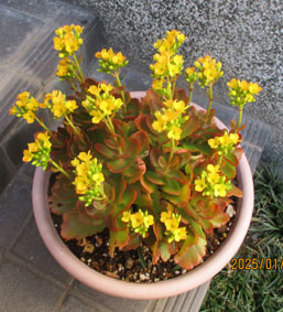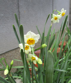 左側の花の名前はカランコエです。去年は一本でしたが今年は株がわかれてこんなに大きくなりました。少々水を忘れても枯れません。素人には育てやすく優しい花です。右側の花は日本水仙です。水仙の中で一番早く花を咲かせます。ほったらかしでも毎年花を咲かします。 |