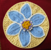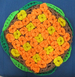 かぎ針編みの花座布団。それぞれ花芯 花弁 土台からなっています。パプコン編み長さを揃えるのが大変でした。 |
