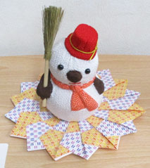 木目込みの雪だるまさん赤い帽子に竹箒をもち雪かきですか?この時期に間に合ってよかったですね。 |
