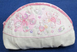 「櫻のヨークポーチ」櫻のアップリケ春らしいポーチでね。アップリケの上に刺繡を刺して込み入った作品ですね。苦労を思い出させます。