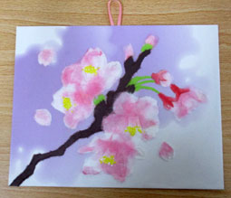 さくらのちぎり絵です花びらが難儀しました下に普通の白い紙を貼り上にぼかしのために薄いピンク色紙を貼るのに指先とかピンセットにくっついて大変でした。 |