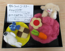 「羊毛フェルトコースター」グーグーあざらし子供のアザラシ可愛いです。うさぎさんは何かなと見間違えました。せんせい代替が上手ですね。 |