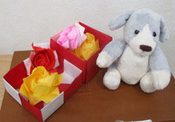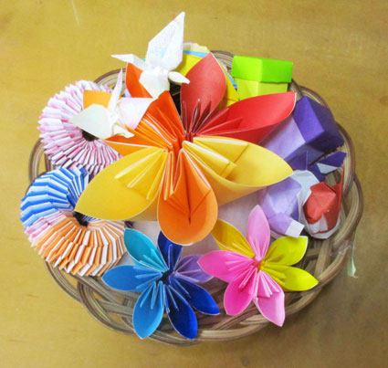 好きな花の折り紙です。シベ付き花(大小)ふた付き箱 かぶと三個 スリンキー 無限万華鏡はひだり側に二個あるドーナツのような形をしたものです。色々ないろをとりあわせたると綺麗ですね。 |
