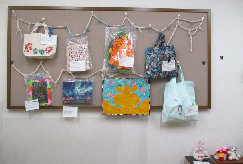 | 25.04..03 4月のミニ展示会の作品です。皆さんそれぞれの作品です。抽選会で頂いた物を作品にステンシル布のバックかぎ針編みの手提げ袋花の座布団カバー スクラッチアート ハワイアンキルト バック 動物の編みぐるみ ワンパクドック等々 |