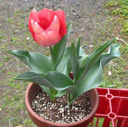 チュウリップの花同じ植木鉢に2球植えています。先に赤色が咲きその右に蕾が見えているのがオレンジ色の花です。チュウリップ は朝開いて夕方にはしぼみますそれがら一週間ほどたって散り始めます。最初の花が散ってからオレンジの花が咲きいっしよに咲いたらよかったのですが別々になって1鉢が2鉢になってしまいました。 |