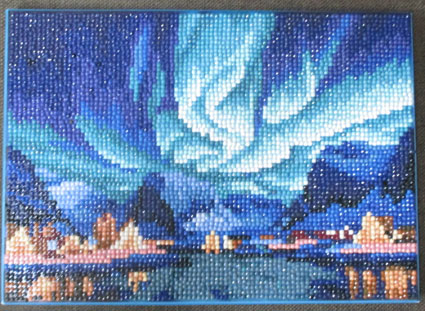 (アートパネル フイヨルドのオーロラ)キヤンバスに表記されている記号と同じ番号のビーズとを確認して専用のペンで木枠付きキャンバスに貼っていきます。大変細かい作業で疲れました。