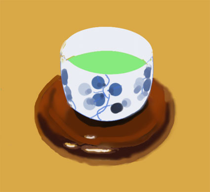 ほっと一息の時にいつものお茶碗でお茶を頂きます。今回おやつは省略しました。クリスタに描くのが難しいからです。茶たくを描くのが思いのほか難しかったです。 |